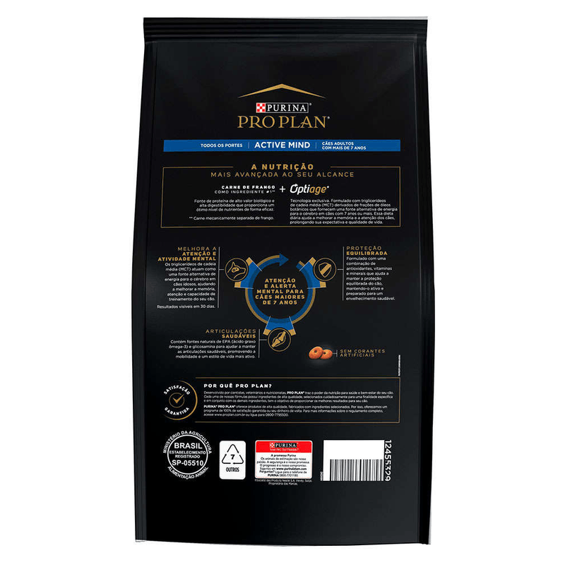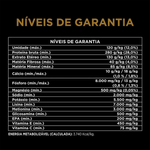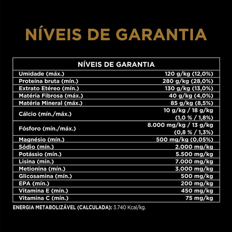Carne mecanicamente separada de frango (16%), milho integral moído*, trigo integral, farinha de vísceras de aves, farelo de glúten de milho-60*, quirera de arroz, polpa de beterraba, fibra de cana-de-açúcar, triglicerídeos de ácidos graxos de cadeia média (5,5%), gordura de frango (preservada com tocoferóis, fonte de vitamina E), óleo de peixe refinado, cloreto de sódio (sal comum), cloreto de potássio, carbonato de cálcio, hidrolisado de fígado de ave e suíno, L-lisina, DL-metionina, vitaminas (A, D3, E, K3, B1, B2, niacina, pantotenato de cálcio, B6, biotina, ácido fólico, B12, C, cloreto de colina), minerais (sulfato de zinco, sulfato ferroso, sulfato de manganês, sulfato de cobre, proteinato de zinco, proteinato de ferro, proteinato de manganês, proteinato de cobre, proteinato de selênio, iodato de cálcio, selenito de sódio), zeolita, sorbato de potássio, sulfato de magnésio, antioxidante BHT. Eventuais substitutivos: fosfato bicálcico, farinha da alga Schizochytrium sp., farinha de peixe, levedura seca de cervejaria, ovo em pó, hidrolisado de fígado de aves, hidrolisado de fígado suíno, farinha de atum, gordura suína, sebo bovino (preservado com tocoferóis, fonte de vitamina E) *Ingredientes transgênicos. Espécies doadoras do gene: Agrobacterium tumefaciens, Bacillus thuringiensis, Streptomyces viridochromogenes e Zea mays.