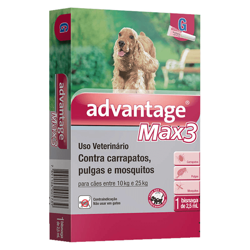 Advantage Max3 é indicado para tratamento e controle das infestações causadas por carrapatos dos cães (Rhipicephalus sanguineus), transmissores da babesiose, erliquiose e da hepatozoonose, eliminando larvas, ninfas e formas aduLtsas.