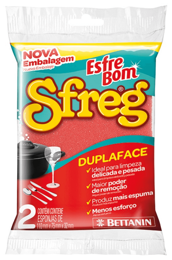 A Esponja Dupla Face EsfreBom Sfreg Amarela e Vermelha com 2 Unidades é altamente eficiente na remoção de sujeiras, não necessitando emprego excessivo de força. Além disso, possui superfície dupla que absorve e faz mais espuma.
