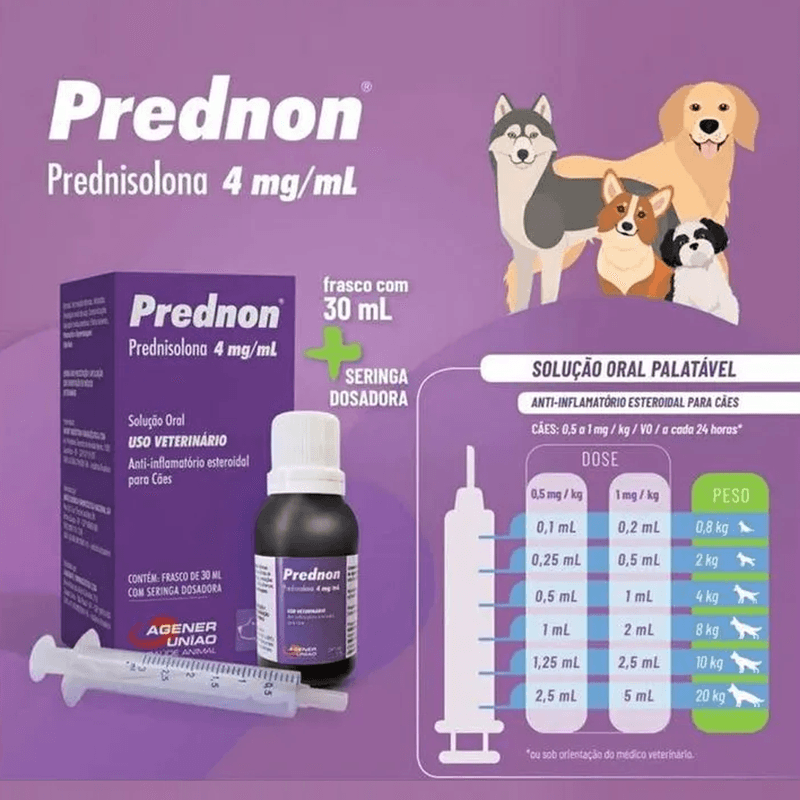 O Prednon 4mg é um anti-inflamatório esteroidal indicado para cães de todas as raças e portes desenvolvido pelo laboratório Agener União Saúde Animal. A solução medicamentosa atua no tratamento das mais variadas infecções no organismo do animal, seu uso deve ser feito via oral, diretamente na boca do cachorro.
