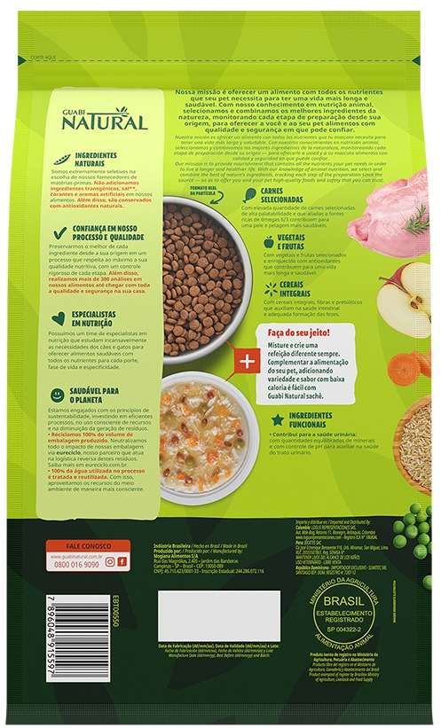 COMPOSIÇÃO BÁSICA: Seleção de Ingredientes de Origem Animal, mín. 68% (dos quais mín. 16% são Carnes Selecionadas: Carne Mecanicamente Separada de Frango e Fígado de Frango; Farinha de Vísceras de Aves, Farinha de Torresmo, Ovo em Pó, Óleo de Vísceras de Aves, Gordura Suína, Óleo de Peixe Refinado, Hidrolisado de Fígado Ave e Suíno). Seleção de Cereais Integrais, mín. 27% (Arroz Integral, Grão de Aveia, Cevada em Grão, Grão de Sorgo). Seleção de Vegetais, Frutas, Vitaminas, Minerais e Ingredientes Funcionais, máx. 5% (dos quais máx. 3% são Vegetais e Frutas Selecionados: Ervilha, Brócolis Desidratado, Espinafre Desidratado, Cenoura Desidratada, Mirtilo Desidratado "Blueberry", Amora Desidratada, Maçã Desidratada, Manga Desidratada, Polpa de Beterraba, Farinha da Alga Schizochytrium sp., Semente de Psyllium, Fibra de Cana-de-Açúcar, Levedura Seca de Cervejaria, Óleo de Linhaça; Cloreto de Potássio, Carbonato de Cálcio, L-Lisina, Taurina, DL-Metionina, Propionato de Cálcio, Sorbato de Potássio, Aditivo Acidificante: Ácido Fosfórico; Aditivos Prebióticos: Inulina e Parede Celular de Levedura Fonte de Mananoligossacarídeos; Antioxidantes Naturais: Extrato de Alecrim e Concentrado de Tocoferóis; Aditivo Adsorvente: Parede Celular de Levedura e Bentonita; Vitaminas: A, D3, E, K3, C, B1, B2, B6, B12, Pantotenato de Cálcio, Ácido Fólico, Ácido Nicotínico, Biotina, Cloreto de Colina; Minerais: Sulfato de Zinco, Sulfato de Ferro, Sulfato de Manganês, Iodato de Cálcio; Minerais Quelatados: Proteinato de Manganês, Levedura Enriquecida com Selênio, Proteinato de Zinco, Proteinato de Cobre).