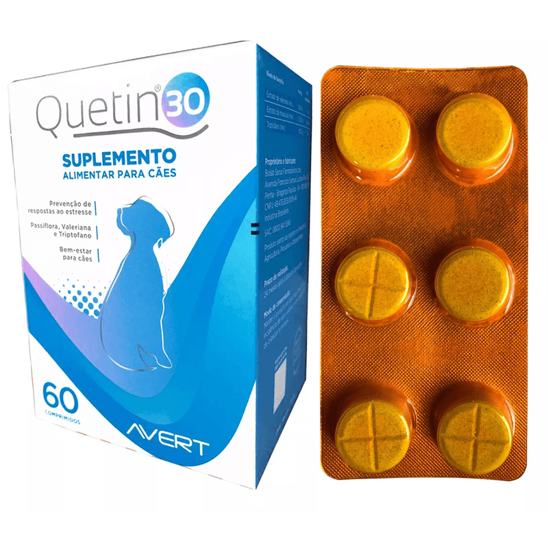 Quetin® 30 é um suplemento alimentar para cães. É indicado, em qualquer fase da vida, para prevenir respostas comportamentais ao estresse decorrente de estímulos perturbadores, como sons aversivos produzidos por fogos de artifício, gritos, carros e tempestades, auxiliando no bem-estar do animal.