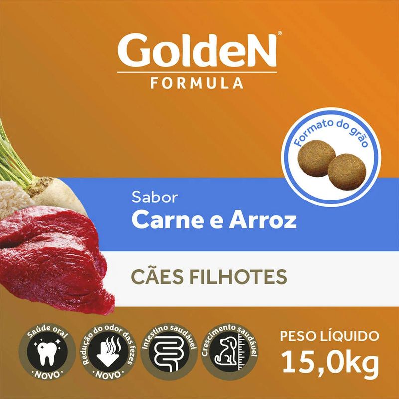 Ração Seca Golden Fórmula Cães Filhotes Carne e Arroz – 15kg, disponível na