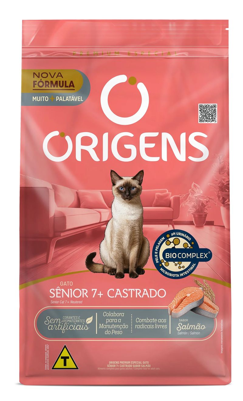 Farinha de vísceras de aves, farinha de peixes, milho moído*, proteína isolada de suíno (farinha de torresmo), farelo de glúten de milho-60*, polpa desidratada de beterraba, farelo de trigo, óleo de aves, óleo de salmão, hidrolisado de fígado de aves e miúdos de suínos, cloreto de sódio, linhaça, parede celular de levedura, inulina, extrato de yucca (0,03%), vitaminas (retinol, colecalciferol, acetato de DL-alfa-tocoferol, menadiona bissulfito de sódio, tiamina, riboflavina, piridoxina, cianocobalamina, cloreto de colina, ácido fólico, niacina, biotina, pantotenato de cálcio), minerais (sulfato de ferro, sulfato de cobre, monóxido de manganês, sulfato de zinco, iodato de cálcio, selenito de sódio, proteinato de zinco, levedura enriquecida com selênio), L-carnitina (0,001%), sulfato de glicosamina, sulfato de condroitina, taurina, ácido fosfórico, ácido cítrico, metionina, ácido propiônico, BHA (Butilhidroxianisol) e BHT (Butilhidroxitolueno). Contém, na composição, alimento geneticamente modificado: milho*. Espécies doadoras de gene: Agrobacterium spp.*, Bacillus thuringiensis*, Streptomyces spp.