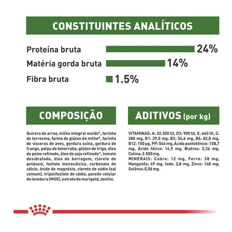 Quirera de arroz, milho integral moído*, farinha de torresmo, farelo de glúten de milho*, farinha de vísceras de aves, gordura suína, gordura de frango, polpa de beterraba, glúten de trigo, óleo de peixe refinado, óleo de soja refinado*, tomate desidratado, óleo de borragem, cloreto de potássio, fosfato monocálcico, carbonato de cálcio, óxido de magnésio, cloreto de sódio (sal comum), tripolifosfato de sódio, parede celular de levedura (MOS), extrato de marigold, zeolita, vitaminas (A, C, D3, E, B1, B2, B6, B12, PP), ácido pantotênico, biotina, ácido fólico, cloreto de colina, betacaroteno, sorbato de potássio, sulfato de cálcio, sulfato de ferro, sulfato de cobre, óxido de zinco, óxido de manganês, iodato de cálcio, levedura enriquecida com selênio, zinco aminoácido quelato, manganês aminoácido quelato, cobre aminoácido quelato, tirosina, DL-metionina, taurina, L-lisina, L-carnitina, palatabilizante à base de fígado de frango, antioxidante (BHA).